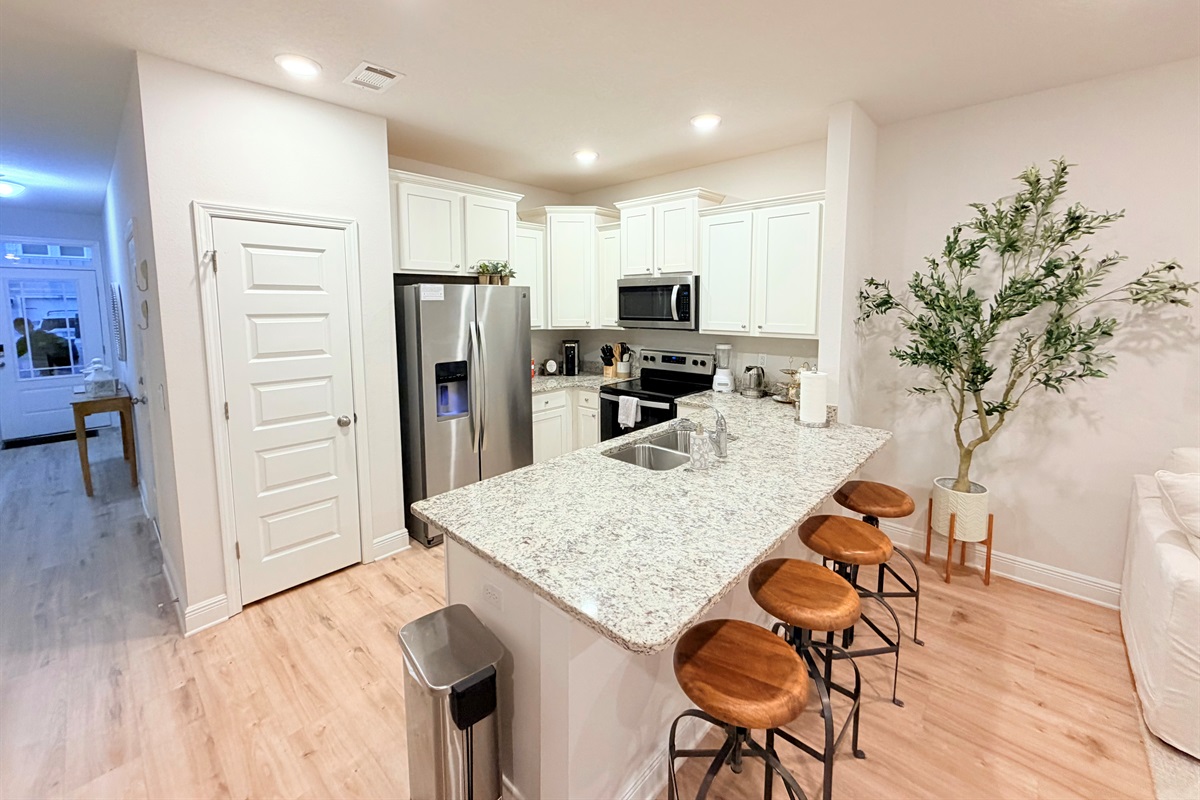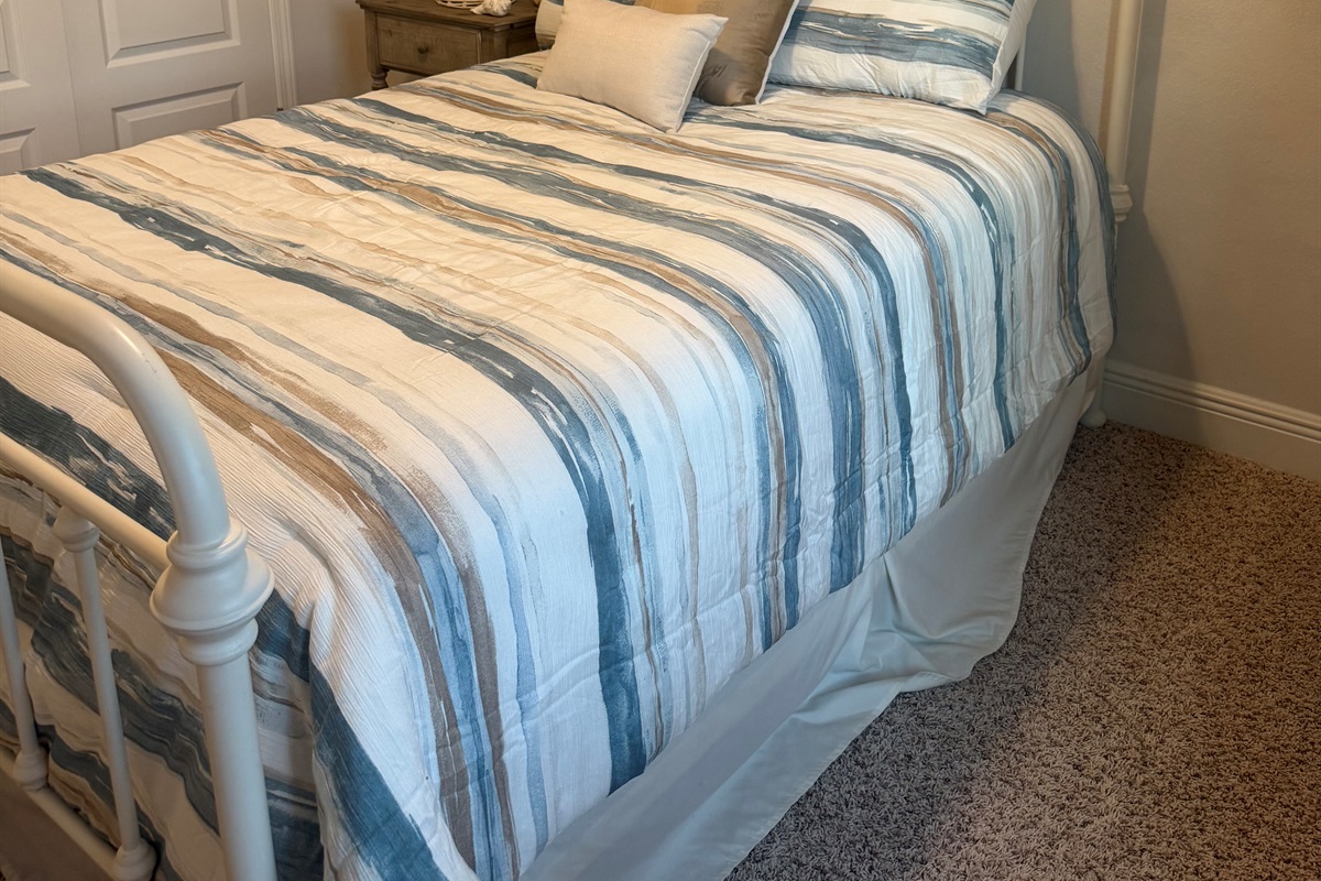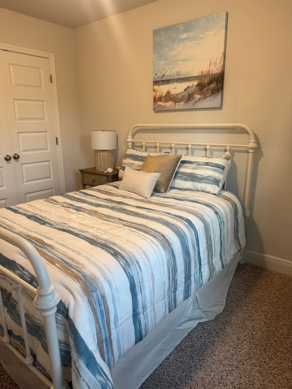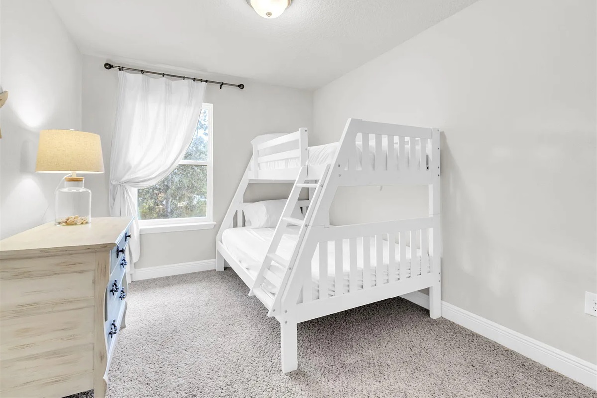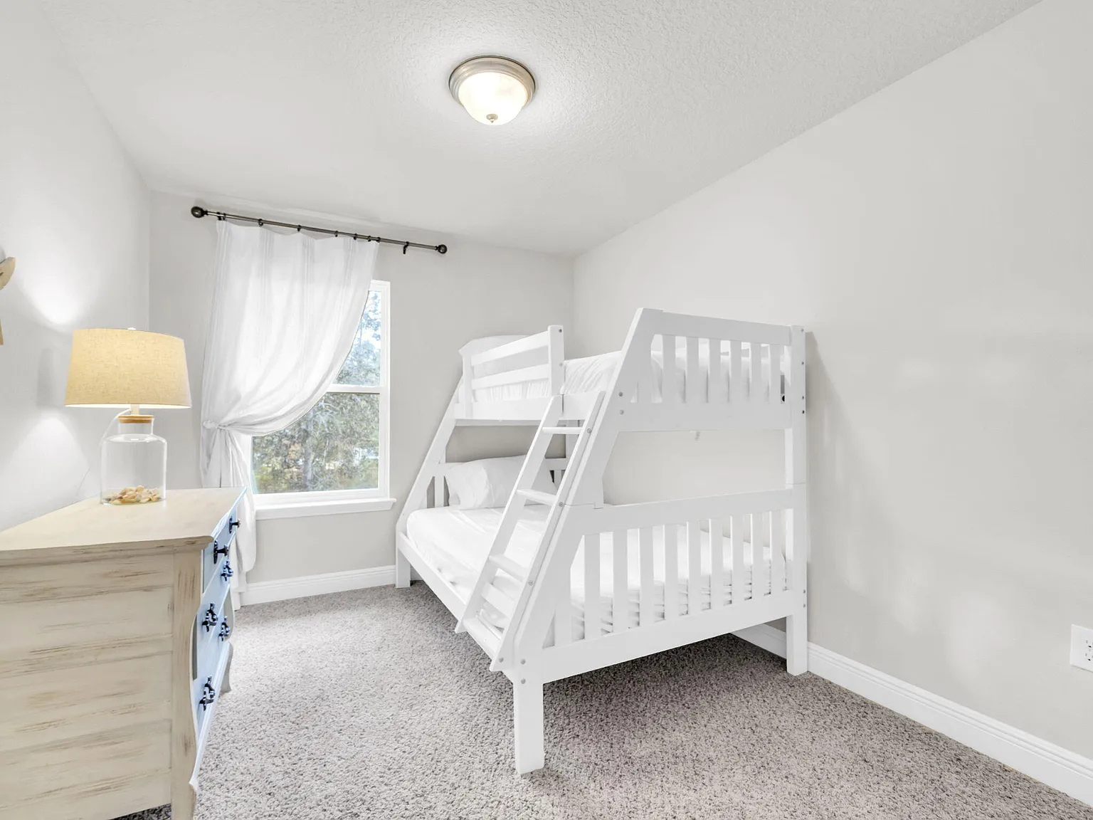 Upstairs, the primary suite provides a calm retreat with a king bed and a private ensuite bathroom featuring a walk-in shower and double vanity. The second bedroom includes a full bed, plus a twin roll-away cot stored in the closet for flexible sleeping arrangements. The third bedroom features a twin-over-full bunk bed, perfect for kids or extra guests. A second full bathroom upstairs offers a tub/shower combination, with a convenient half bath located on the main level.